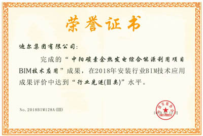 2018年12月,由中國(guó)安裝協(xié)會(huì)BIM應(yīng)用與智慧建造分會(huì)主辦的2018年安裝行業(yè)BIM技術(shù)應(yīng)用成果交流會(huì)暨現(xiàn)場(chǎng)觀摩會(huì)上,迪爾集團(tuán)有限公司選送的“中陽(yáng)碳素余熱發(fā)電綜合能源利用項(xiàng)目BIM技術(shù)應(yīng)用”經(jīng)過(guò)優(yōu)選推薦、資料初審、專業(yè)審查、擇優(yōu)入圍、現(xiàn)場(chǎng)發(fā)布、專家評(píng)分等層層選拔,從129個(gè)行業(yè)單位169項(xiàng)作品中脫穎而出,達(dá)到行業(yè)先進(jìn)(Ⅲ類)水平。